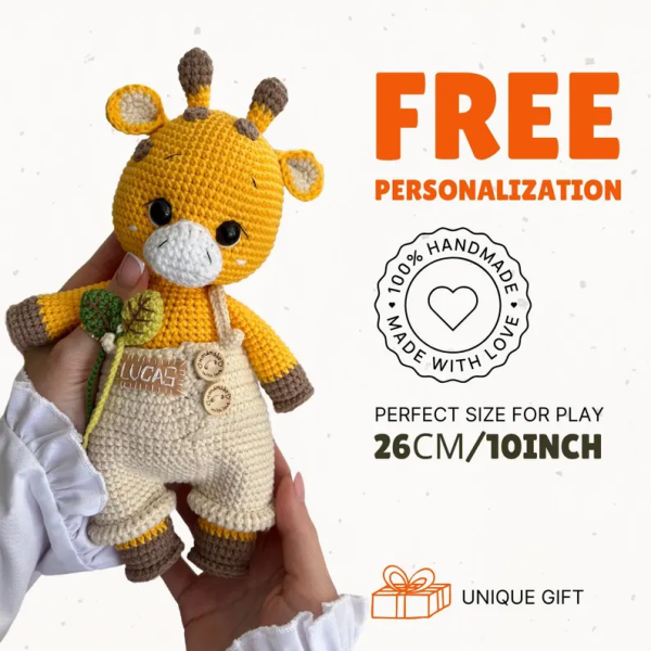 Be the first to review “Cute amigurumi giraffe toy, crochet safari stuffed animals, baby shower gift, baby sleeping toy, crochet giraffe, safari nursery decor This cute amigurumi giraffe toy is a charming addition to any baby’s world, perfect for cuddles and gentle play. Handmade with care, this crochet giraffe belongs to a delightful collection of crochet safari stuffed animals, making it an ideal baby shower gift or a thoughtful keepsake for new parents. Soft and safe, it doubles as a baby sleeping toy, bringing comfort during naptime. Either placed on a shelf or in a crib, it also serves as lovely safari nursery decor, adding warmth and whimsy to your little one’s space. __________________________ ◌ Height: 9.5 – inches (24 – 26 cm) Clothes are removable. ◌ Materials: organic cotton yarn, hypoallergenic holofiber ◌ NOTE: The toy comes with securely attached safety eyes (plastic eyes fastened from the inside with locking washers). If you prefer embroidered eyes or a different eye color, please mention your preference in the personalization box. ◌ Personalization: You can add a name for your toy, just write the name or first letter in the personalization window. We personalize the toy for free. ◌ Packaging: I offer beautiful free gift wrapping with every order. Each item comes in a reusable cotton bag and includes a plantable seed paper gift card! ◌ Shipping time: 7-14 business days. __________________________ Personalization is available for almost all toys in my store, so please contact me and I will answer all your questions. Best regards, Mariia”
