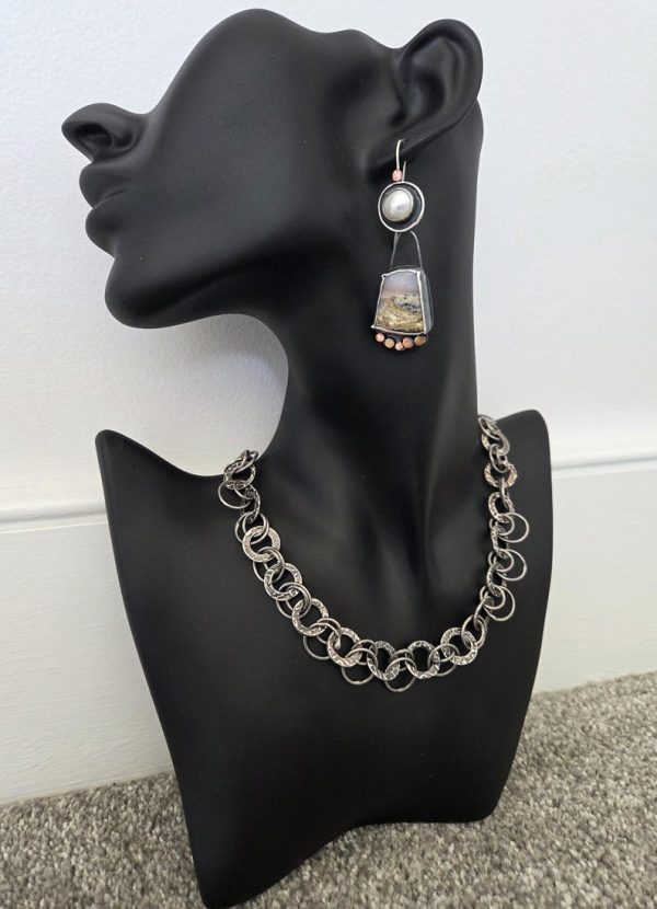 Natural Pink Opal in Matrix slabs (25x16mm) swing with Freshwater White Pearls (9mm) that have been set in darkly oxidized sterling and fine silver bezels. Flattened dots of copper and brass highlight the stone colors. Soldered sterling ear wires. These are one-of-a-kind rustic, artisan, double-gem, mixed-metal, arty earrings.